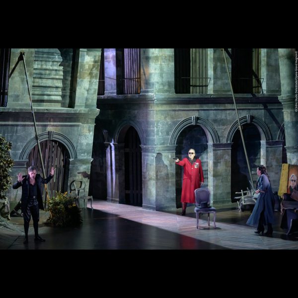 Le décor de David McVicar aménage deux espaces : un quadrant « supérieur », délimité par d’imposants murs vert et or, servant à la fois de palais et de temple ; et, trois marches plus bas, un quadrant « extérieur », où Medea et Neris, les « étrangères », passent l’essentiel de l’action. En arrière du premier quadrant, d’immenses miroirs inclinés ouvrent de fascinantes perspectives aux spectateurs – du moins à ceux assis dans la partie inférieure de la salle.