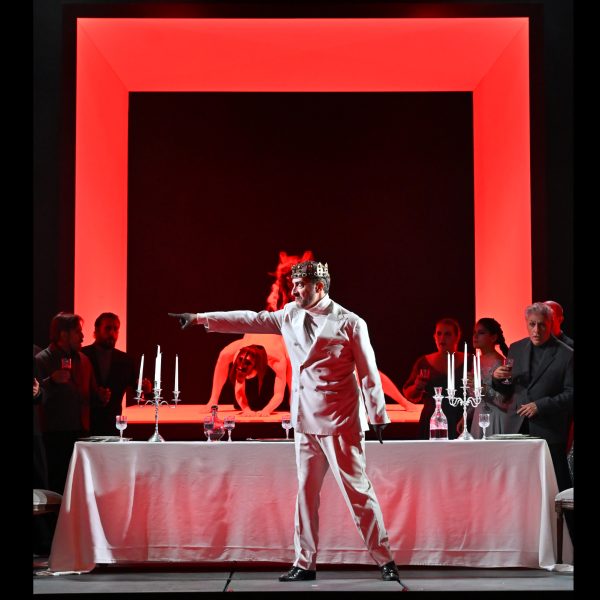 Avec cette reprise, assurée par Ion Kessoulis, on reste dans le purement décoratif, la mer (à Wetzlar !) agitée au fond, une balançoire, des tables de bistrot, de grandes horloges comtoises, ramenant au premier plan un réalisme bon enfant, avant qu’une sorte de meringue écrasée vienne recevoir les derniers instants du héros.