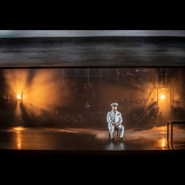 C’est avec une proposition scénique radicalement différente que se poursuit le festival printanier de l’Opéra de Lyon. Richard Brunel opte en effet pour une esthétique bien plus symboliste. Après un Prologue épuré, vue océane et fumigènes ras du sol mâtinant un exquis gris bleuté, surgit un dispositif combinant d’imposantes plateformes mobiles que les techniciens déplacent en temps réel pour « construire » puis figurer des fragments de bateau dans lesquels se nouera la tragique intrigue issue d’une nouvelle d’Herman Melville. Des escaliers et échelles assurent le passage d’une plateforme à l’autre. Dans un ballet presque incessant mais toujours fluide, le bateau ne cesse ainsi de se métamorphoser, ouvrant des espaces ou ménageant des exiguïtés, rendant ainsi fidèlement compte de la vie confinée à bord d’un navire. Voulu par le metteur en scène et son scénographe, un lien évident entre théâtre et marine se dessine nettement.