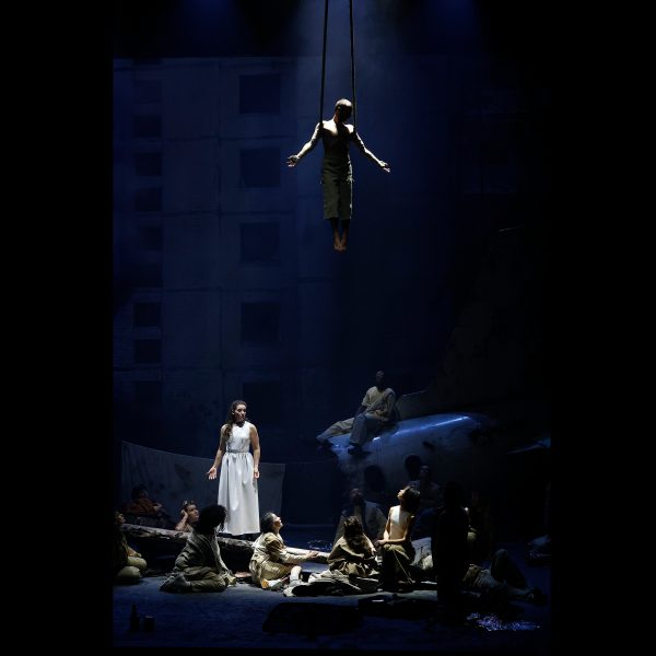 Refusant tout ancrage spatio-temporel précis, le décor de Leila Fteita fonctionne mieux : un espace à mi-chemin entre fantasy et archaïsme, d’inspiration vaguement sarde (le puits sacré, les costumes de Carola Fenocchio). Le dispositif consiste en un amphithéâtre de pierre, sur les gradins duquel les chœurs se tiennent immobiles (on se croirait dans Oedipus Rex !), avec une fontaine en son centre. Au III, un mur vient fermer la perspective, d’où se détache un tronc d’arbre sec. Le tout baigne dans les lumières, tour à tour bleu azur et rouge sang, d’Andrea Ledda.