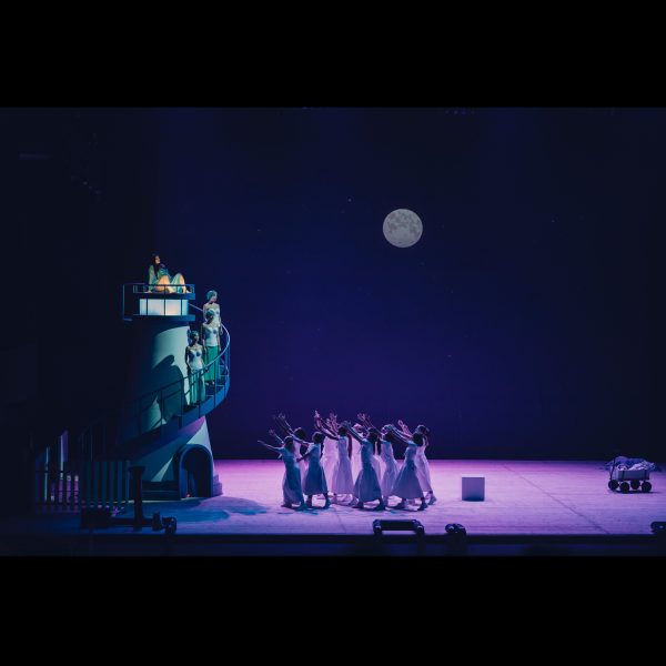 Silvia Costa, déjà responsable d’une des « Journées » – Freitag, monté à l’Opéra de Lille en 2022 (voir O. M. n° 188 p. 50) – a conçu un spectacle bigarré qui épouse le monde de l’enfance. Entre le Club Mickey et Blanche-Neige et les Sept Nains (premier long métrage du studio d’animation réalisé en 1937), l’univers du dessin animé selon Disney envahit non sans fraîcheur et à un rythme soutenu le plateau, avec ses couleurs harmonieuses distribuées dans le détail des costumes, le jeu des interprètes, la lumière changeante et une galaxie en perpétuelle mutation. D’ailleurs, qui nous dit que Licht, découpé en sept opéras, n’eut pas pour point de départ le féerique Blanche-Neige des frères Grimm (1882) ? Un conte musical où la mise en scène s’en donne à cœur joie pour lancer la danse « des poussettes », où des gnomes barbus aux chapeaux pointus entament un ballet frénétique de landaus, poussés par une armée de nourrices sous le regard bienveillant d’une Ève juchée sur un phare.